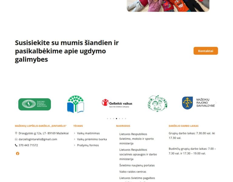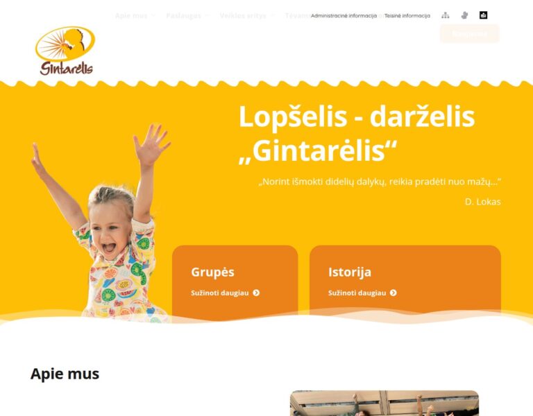 Mažeikiai'deki Gintarėlis Kreş ve Anaokulu için, ailelerin temel bilgilere hızlıca erişmesini sağlayan, net ve kullanıcı dostu bir web sitesi oluşturduk. Yeni site, kurumun değerlerini, günlük yaşamını ve eğitim ortamını sıcak, güvenilir ve kolay gezilebilir bir şekilde sunar.
