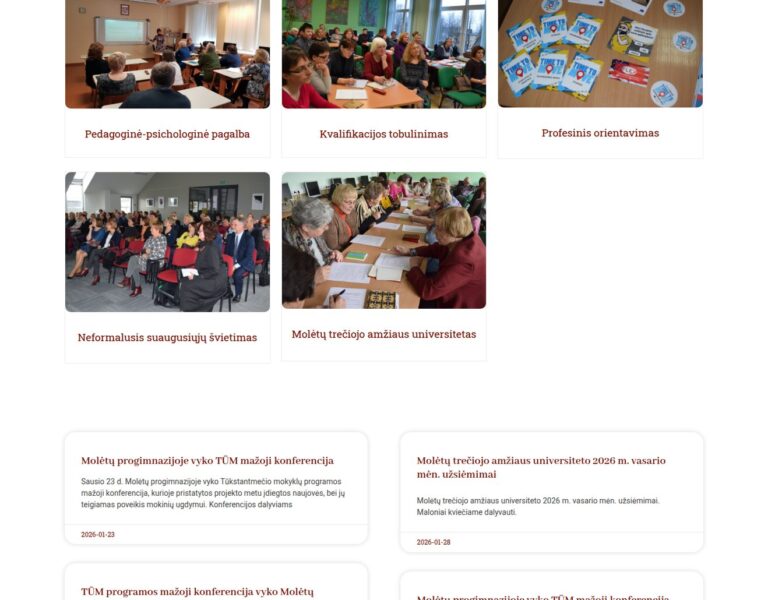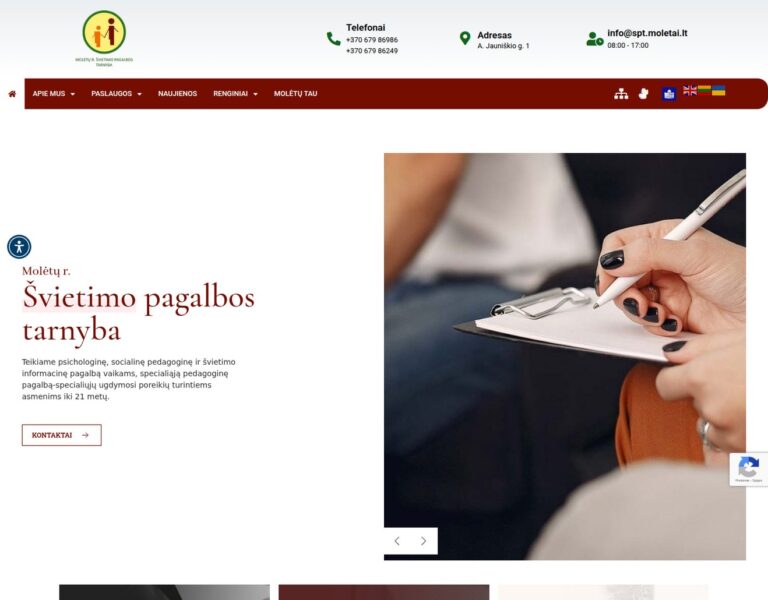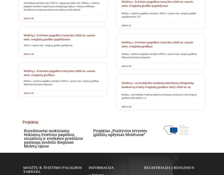 Molėtai Bölgesi Eğitim Destek Hizmeti için, ailelerin, eğitimcilerin ve uzmanların temel bilgilere daha kolay ulaşmasını sağlayan bir web sitesi tasarlayıp geliştirdik. Platform, hizmetlere, güncellemelere ve yerel topluluk için pratik rehberliğe erişimi iyileştirerek kurumun kamu hizmeti rolünü destekliyor.