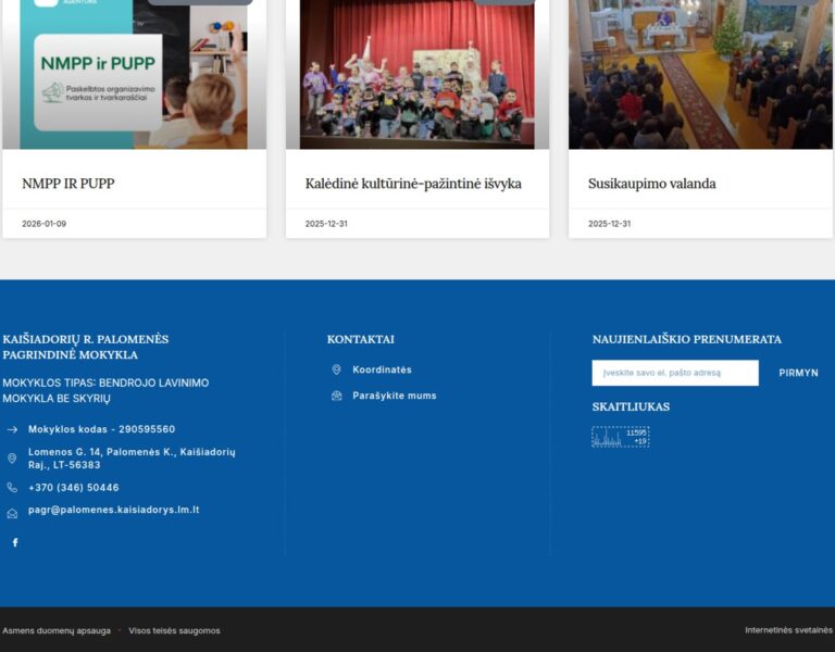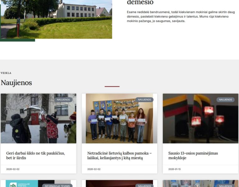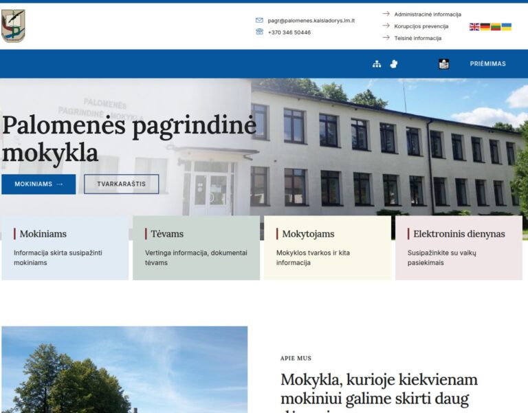 Kaišiadorys Bölgesi’ndeki Palomenė İlkokulu için, öğrencilerin, velilerin ve personelin temel bilgilere daha kolay erişebilmesi amacıyla yeni bir web sitesi tasarladık ve geliştirdik. Ortaya çıkan sonuç, günlük iletişimi destekleyen ve okulun topluluğuyla bağını güçlendiren, açık ve davetkâr bir dijital varlık oldu.