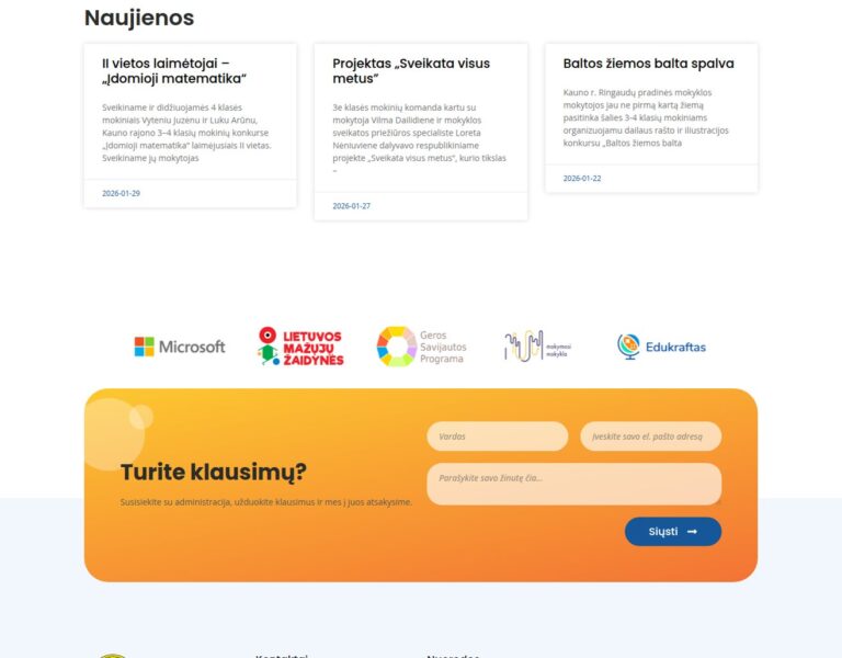 Kaunas Bölgesi’ndeki Ringaudai İlkokulu için, veliler, öğrenciler ve personelin temel bilgilere kolayca ulaşabilmesini sağlayan modern bir okul web sitesi oluşturduk. Platform; okulun değerlerini, günlük yaşamını ve eğitim olanaklarını açık ve erişilebilir bir formatta sunarak yerel toplulukla daha güçlü iletişimi destekler.
